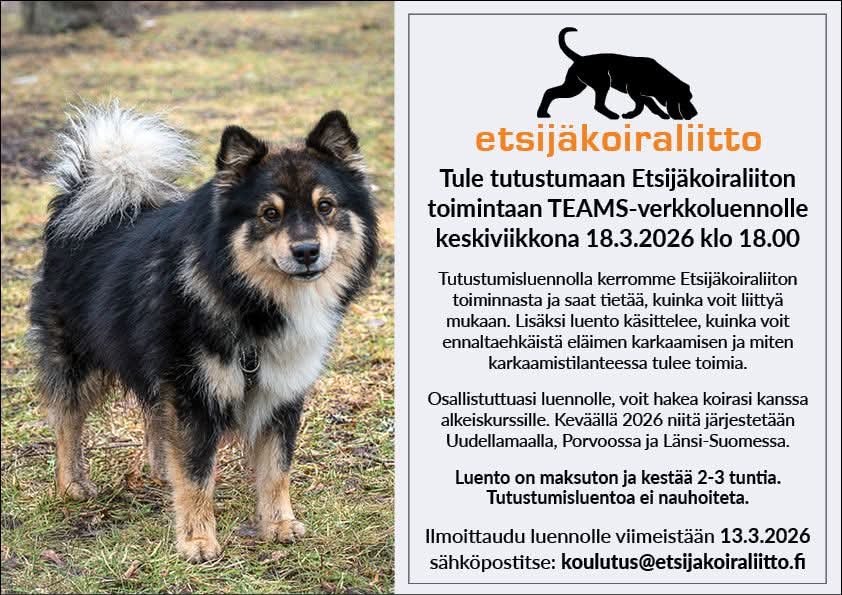 Tutustumisluennolla kerromme Etsijäkoiraliiton toiminnasta ja saat tietää, kuinka voit liittyä mukaan.